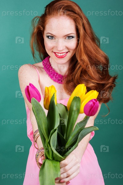Красивая рыжеволосая девушка держит тюльпаны