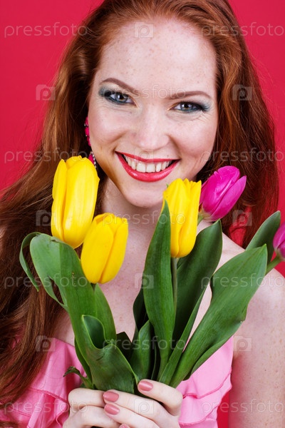 Красивая рыжеволосая девушка держит тюльпаны