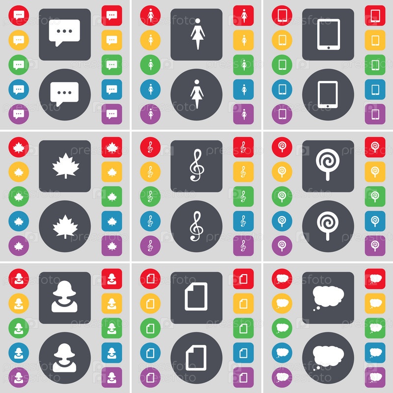 Чат пузырь, силуэт, планшетный ПК, кленовый лист, скрипичная клавиша, конфета, аватар, файлы, облако чата значок символа. большой набор плоских цветных кнопок для вашего дизайна. вектор
