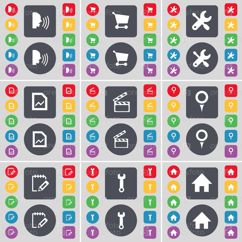 Разговор, корзина, ключ, файл, клаппер, контрольно-пропускной пункт, ноутбук, гайковерт, дом значок символа. большой набор плоских цветных кнопок для вашего дизайна. вектор
