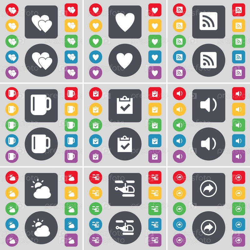 Сердце, RSS, Кубок, опросы, звук, облако, вертолет, обратный символ значка. Большой набор плоских цветных кнопок для вашего дизайна. вектор