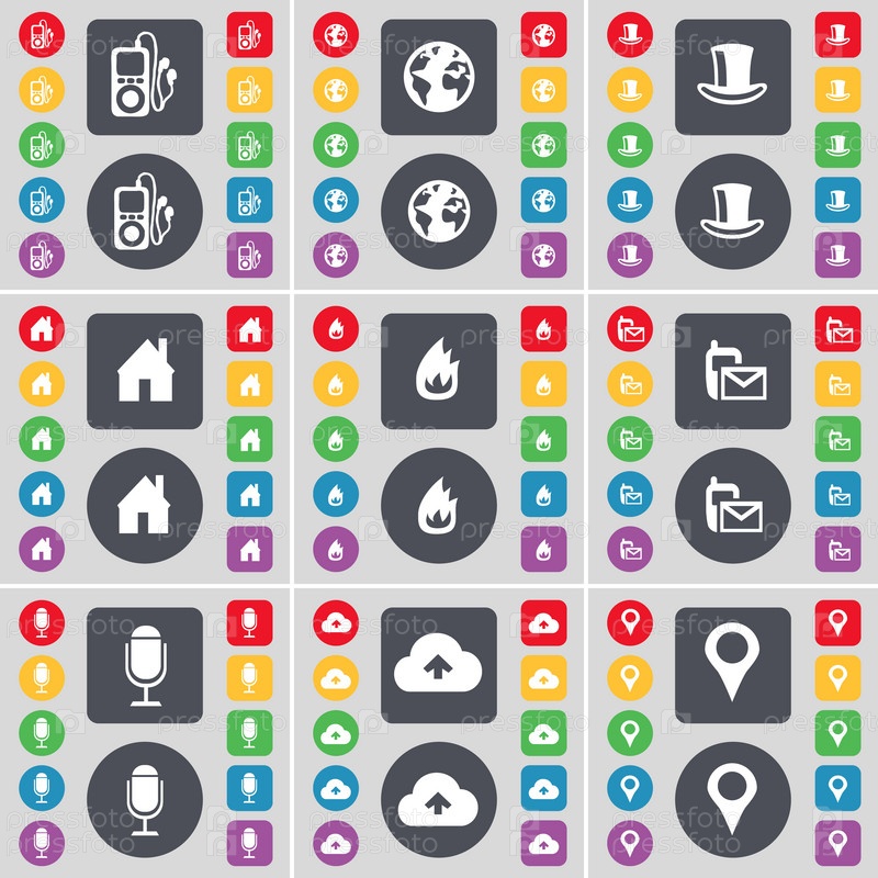 MP3-плеер, земля, шелковая шляпа, дом, огонь, SMS-сообщения, микрофон, облако, символ значка контрольной точки. Большой набор плоских цветных кнопок для вашего дизайна. вектор