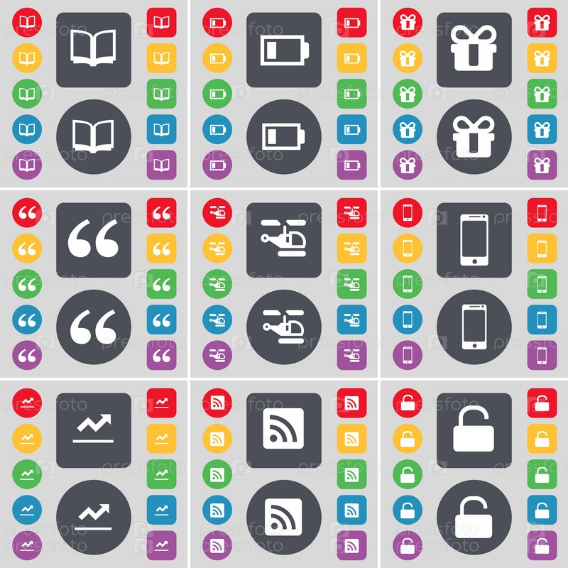 Книга, батарея, подарок, знак запятой, яхты.Прекрасное, смартфон, граф, RSS, символ икон замка.Большой набор плоских цветных кнопок для вашего дизайна.Вектор