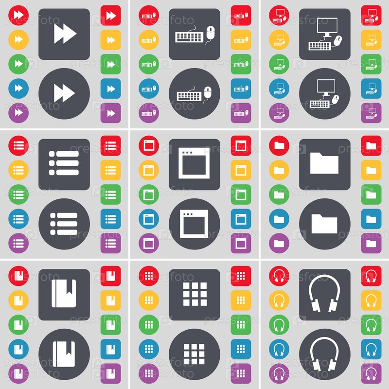 Перемотка назад, клавиатуры, ПК, список, окна, папка, словарь, приложения, символ значок наушников. Большой набор плоских, цветные кнопки для вашего дизайна. Вектор