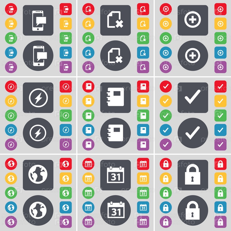 SMS, файл, плюс, Flash, ноутбук, тик, земля, календарь, символ иконки замка. большой набор плоских цветных кнопок для вашего дизайна. вектор