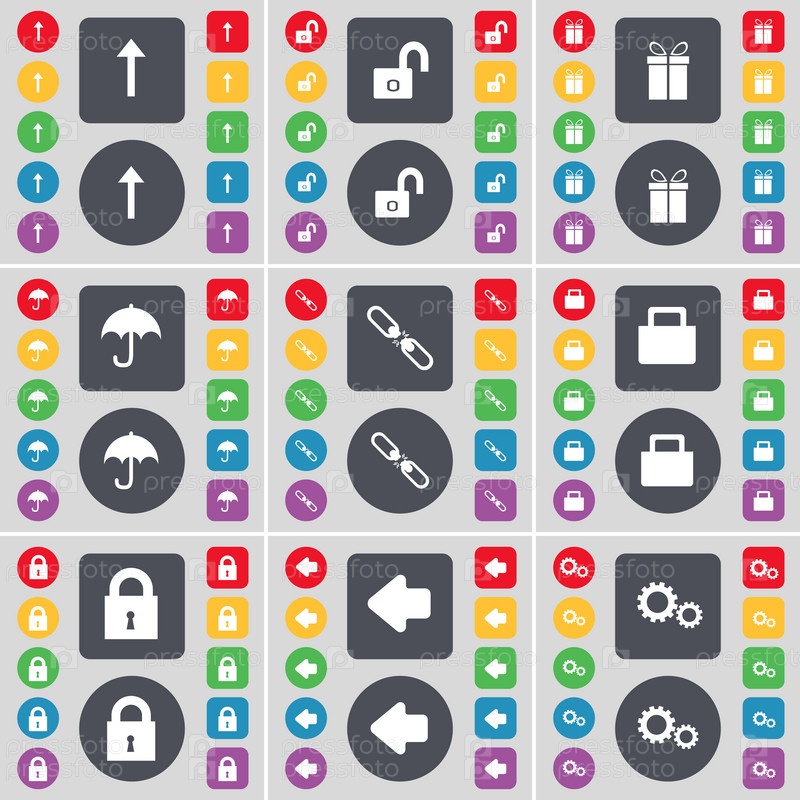 Стрелка вверх, замок, подарок, зонтик, ссылка, замок, стрелка влево, значок шестеренка. Большой набор плоских, цветные кнопки для вашего дизайна. Вектор