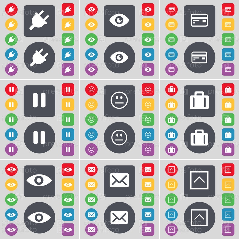 Гнездо, видение, кредитных карт, пауза, улыбка, чемодан, интуиция, символ значок сообщения. Большой набор плоских, цветные кнопки для вашего дизайна. Вектор