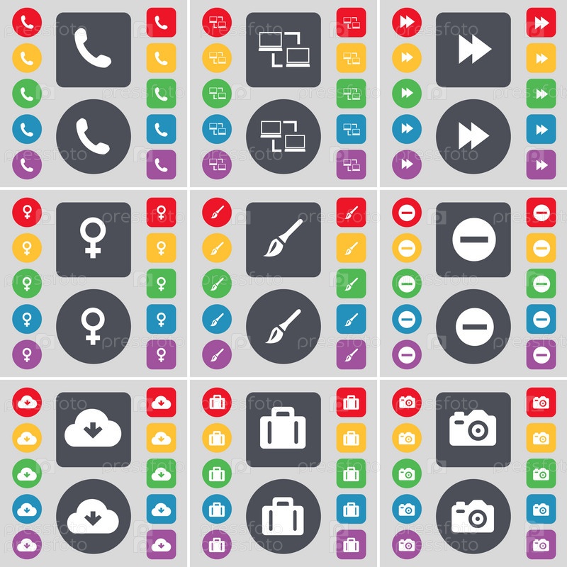 Приемник, покрытие, ревинд, символ Венеры, кисти, минус, облако, чемодан, иконка символа Камера. Большой набор плоских цветных кнопок для вашего дизайна. вектор