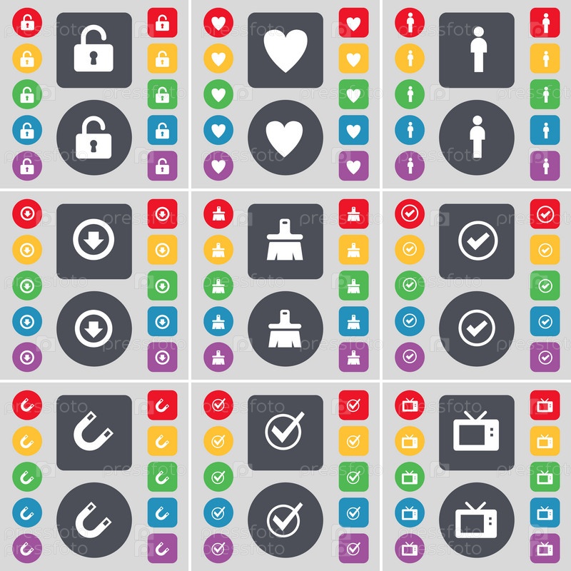 Замок, сердце, силуэт, стрелка вниз, кисти, тик, магнит, тик, Ретро ТВ значок символа. Большой набор плоских, цветные кнопки для вашего дизайна. Вектор