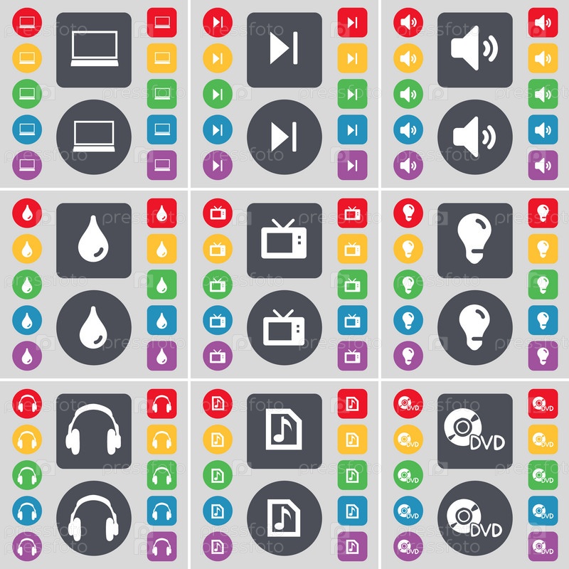 Ноутбук, пропускать СМИ, звук, падение, ретро-ТВ, лампочки, наушники, музыкальные файлы, значок символа DVD. Большой набор плоских цветных кнопок для вашего дизайна. вектор