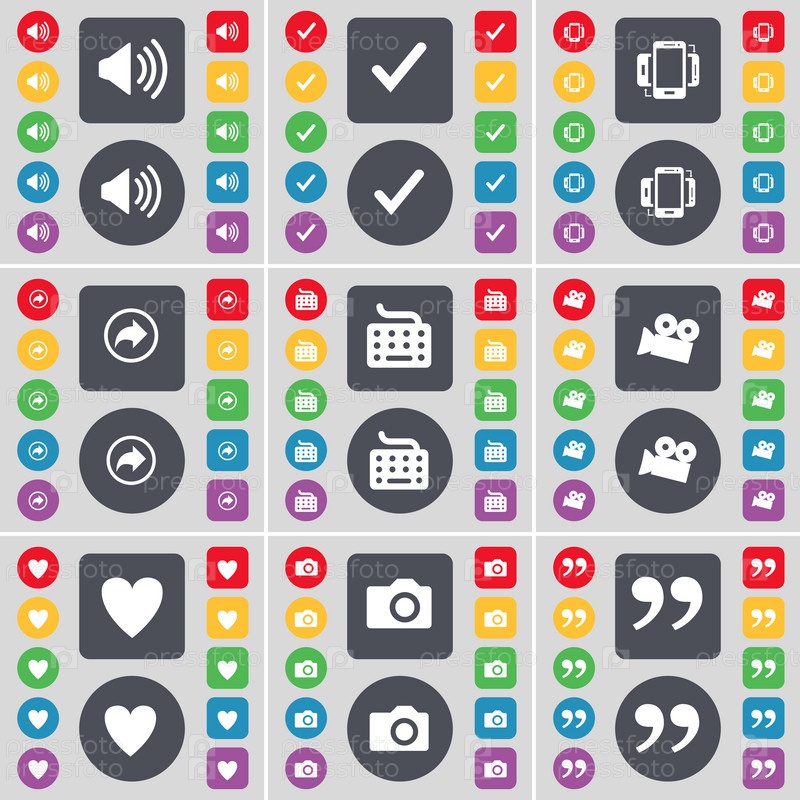 Звук, тик, смартфон, спине, клавиатуры, пленочной камеры, сердце, камеры, значок символ кавычки. Большой набор плоских, цветные кнопки для вашего дизайна. Вектор