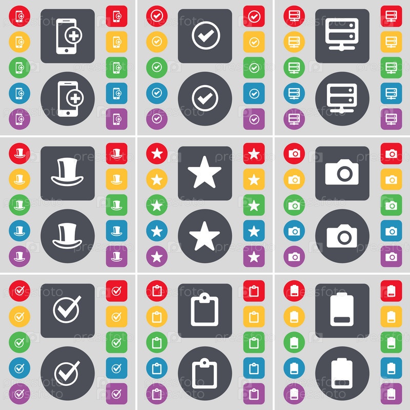 Смартфон, тик, сервера, шелк шапка, звезда, камеры, тик, обследования, значок символ батареи. Большой набор плоских, цветные кнопки для вашего дизайна. Вектор