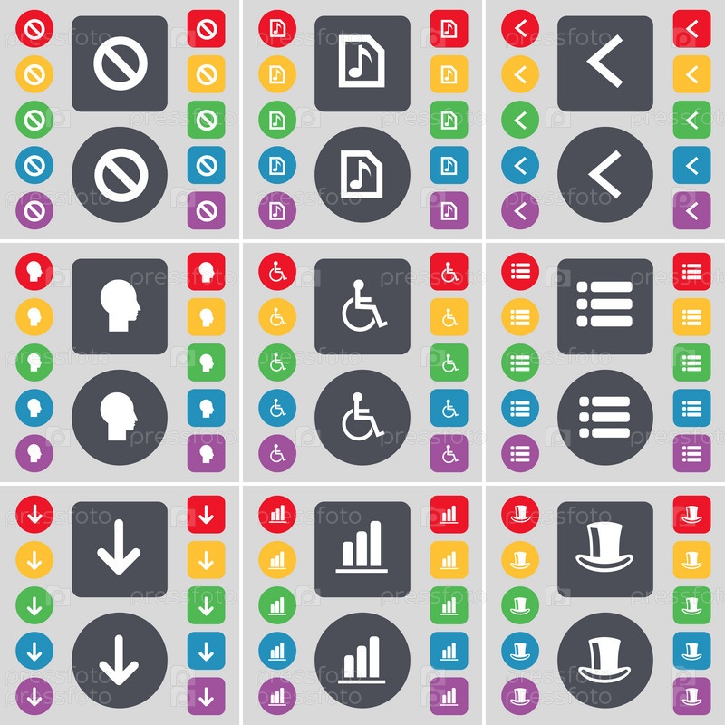 Стоп, музыкальных файлов, стрелка влево, силуэт, инвалид, список, стрелка вниз, диаграмма, шелк шапка значок символа. Большой набор плоских, цветные кнопки для вашего дизайна. Вектор