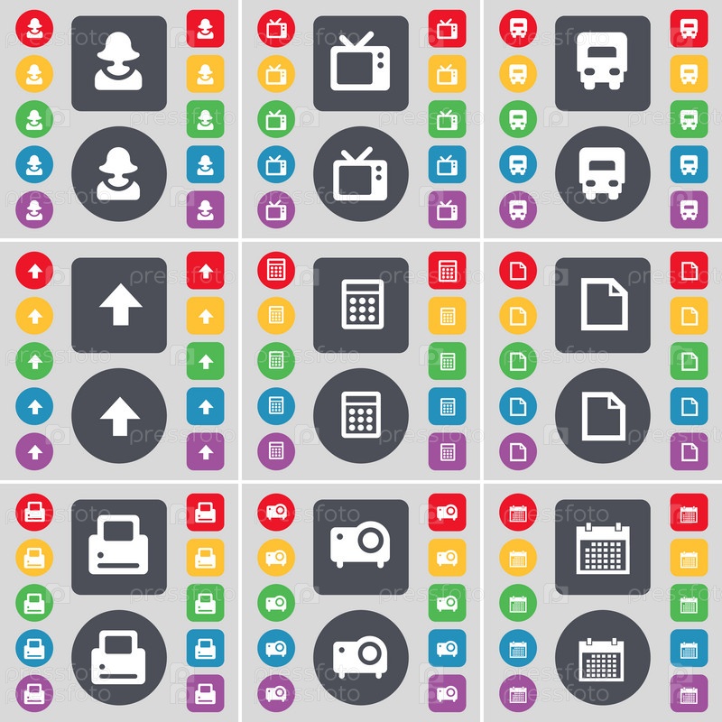 Аватар, Ретро ТВ, грузовик, стрелка вверх, калькулятор, файл, принтер, символ значок календаря. Большой набор плоских, цветные кнопки для вашего дизайна. Вектор