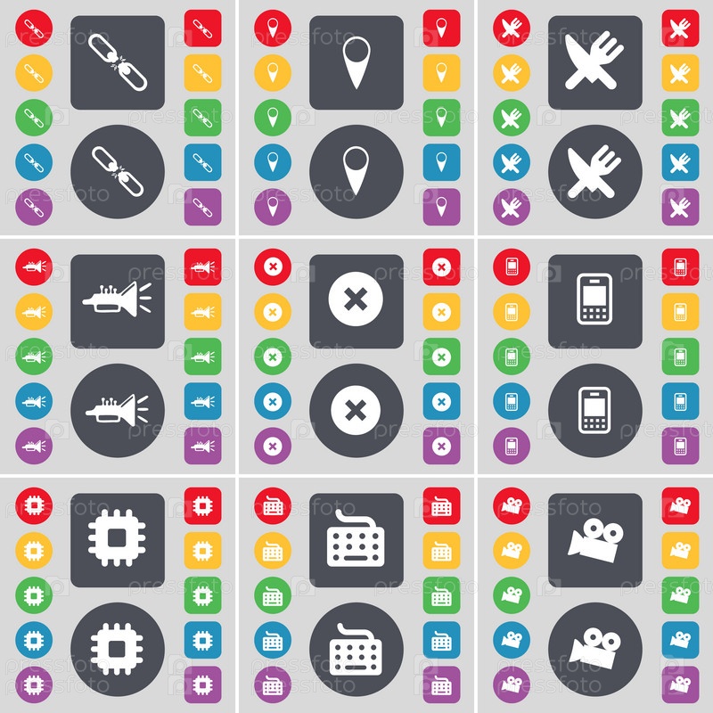 Ссылка, контрольно-пропускной пункт, вилка и нож, Trumped, остановка, мобильный телефон, процессор, клавиатура, кинокамера значок символа. Большой набор плоских цветных кнопок для вашего дизайна. вектор