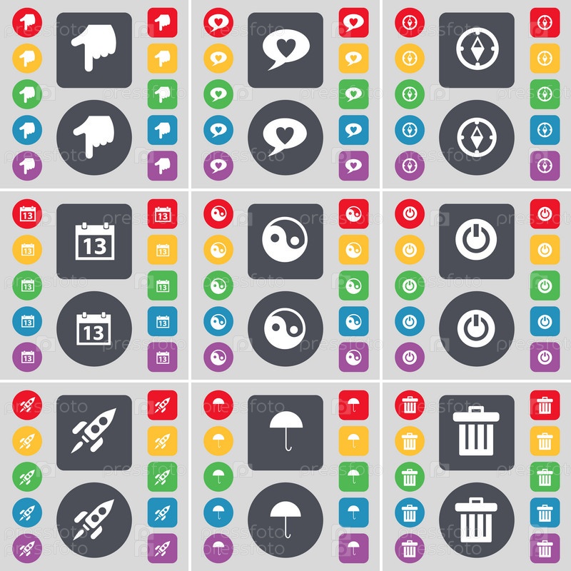 Рука, чат пузырь, компас, календарь, Инь-Ян, власть, ракета, зонтик, мусор может значок символа. Большой набор плоских, цветные кнопки для вашего дизайна. Вектор