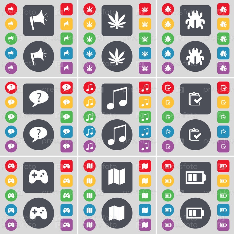 Мегафон, марихуаны, ошибка, чат пузырь, обратите внимание, опрос, джойстика, карта, значок символ батареи. Большой набор плоских, цветные кнопки для вашего дизайна. Вектор