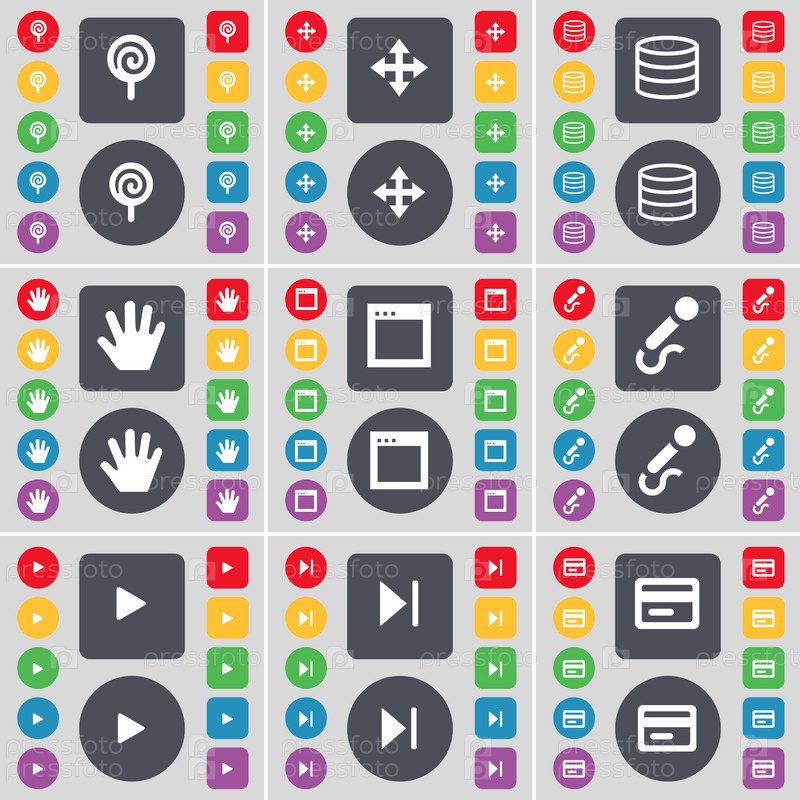 Леденец, перемещение, пропускать базы данных, рука, окна, микрофон, играть, СМИ, кредитной карты значок символ. Большой набор плоских, цветные кнопки для вашего дизайна. Вектор