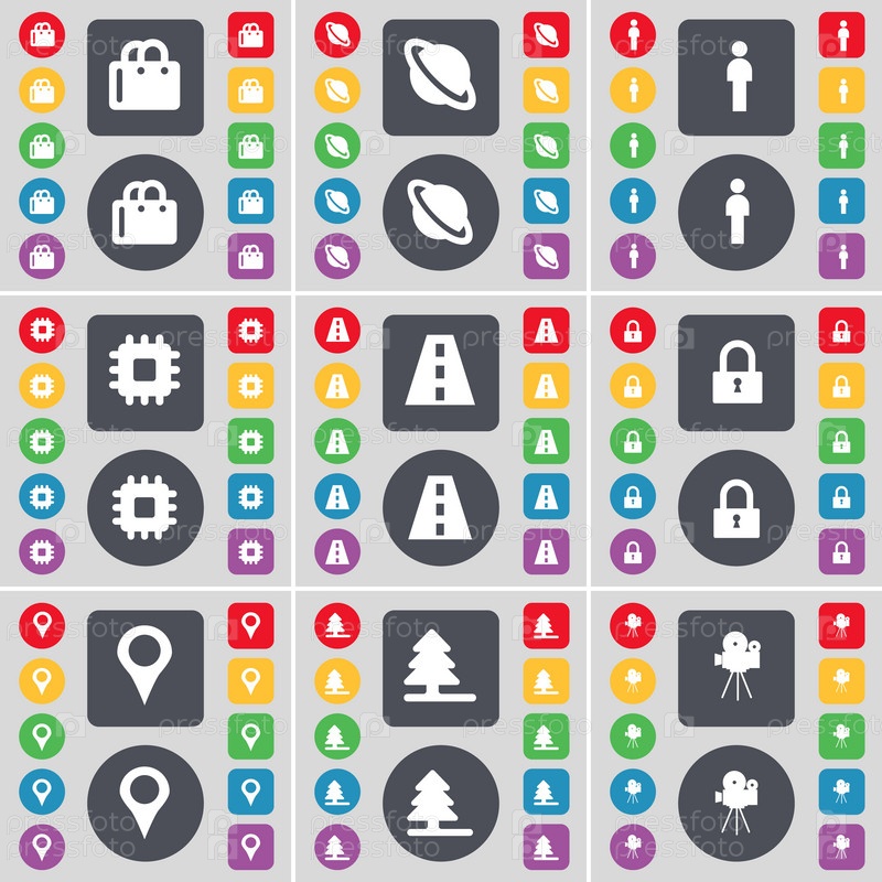 Сумка, планета, силуэт, процессор, дороги, замок, контрольно-пропускной пункт, елочка, фильм камеры значок символа. Большой набор плоских, цветные кнопки для вашего дизайна. Вектор