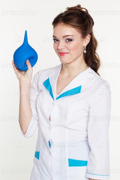 Молодая медсестра с клизмой в руках