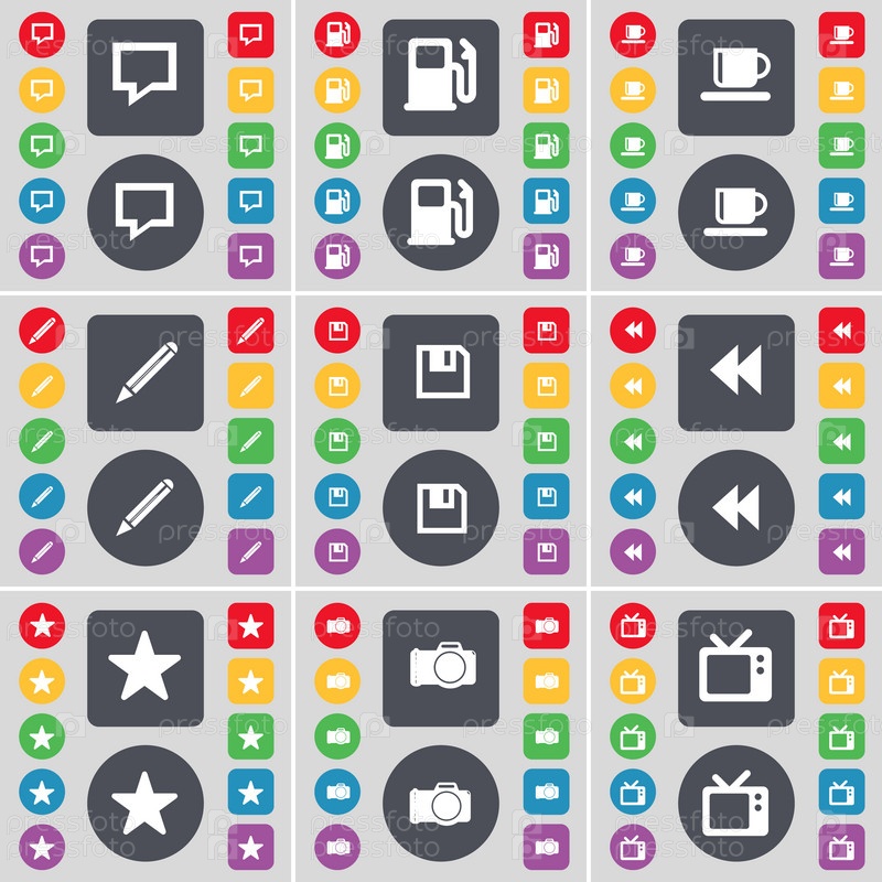 Чат-пузырь, заправка, чашка, карандаш, флопи, ревинд, звезда, камера, иконка символа Ретро ТВ. Большой набор плоских цветных кнопок для вашего дизайна. вектор