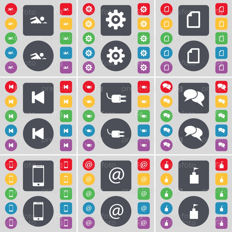 Плавец, Гир, Файл, Скип медиа, розетка, чат, смартфон, почта, флаг башня значок символа. Большой набор плоских цветных кнопок для вашего дизайна. Вектор