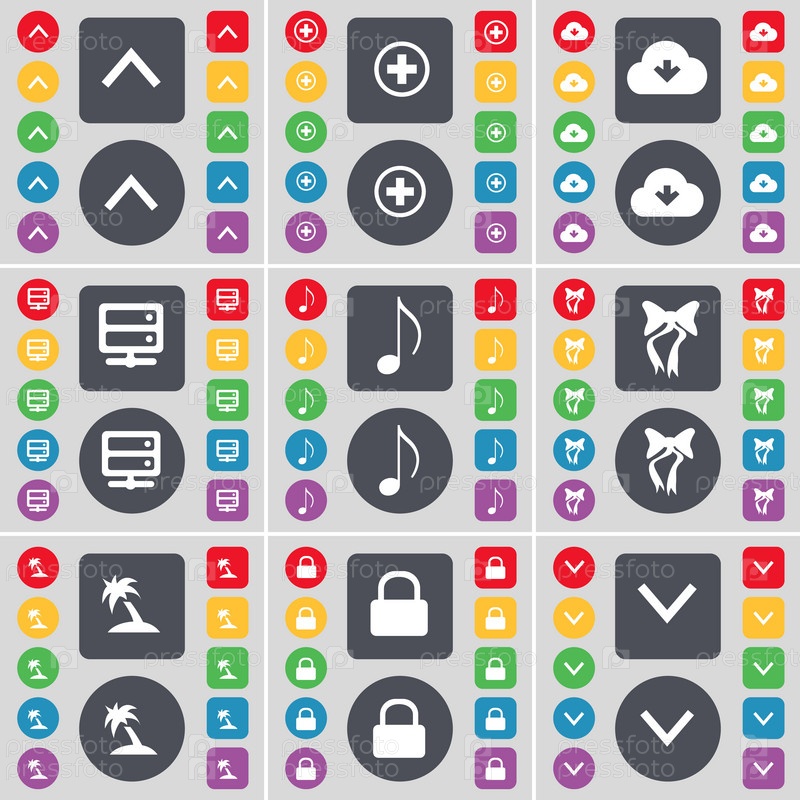 Стрелка вверх, плюс, облако, сервер, Примечание, лук, пальмы, замок, стрелка вниз значок символа. Большой набор плоских, цветные кнопки для вашего дизайна. Вектор