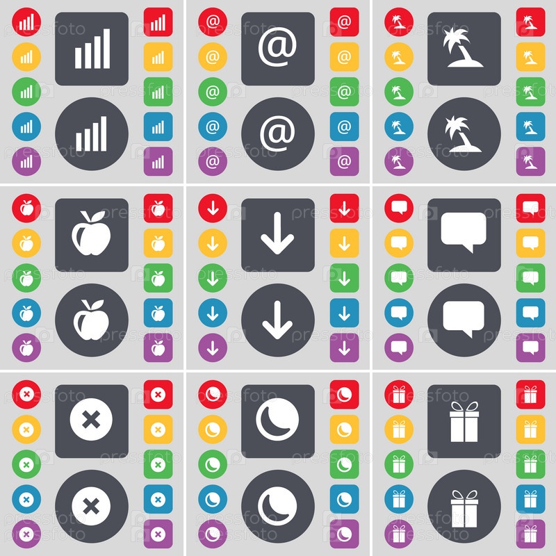 Диаграмма, почта, пальмы, яблоки, стрелка вниз, пузырь чата, стоп, Луна, значок символа Gift. Большой набор плоских цветных кнопок для вашего дизайна. вектор