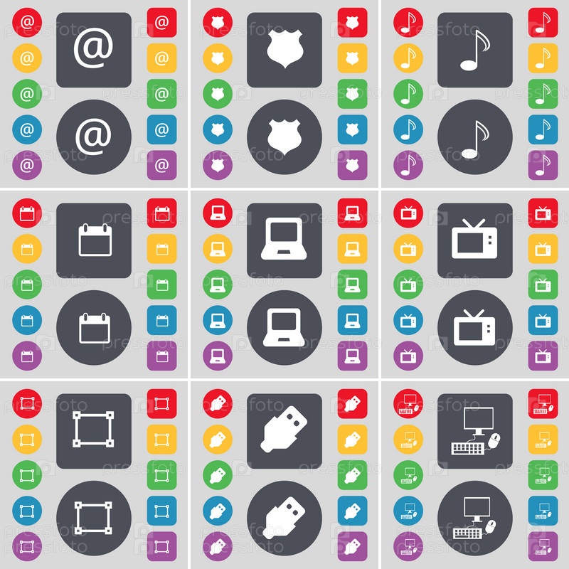 Почта, полицейский значок, примечание, камера, ноутбук, ретро-ТВ, рама, USB, символ значка ПК. Большой набор плоских цветных кнопок для вашего дизайна. вектор