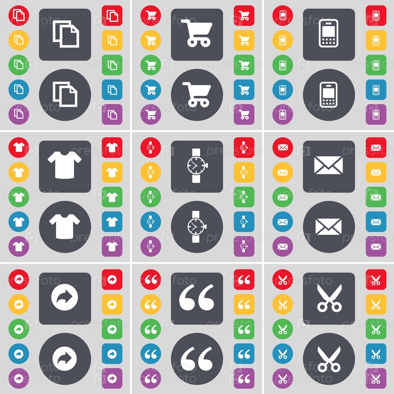 Копирование, корзина, мобильный телефон, футболка, наручные часы, сообщение, обратно, кавычки, ножницы значок символа. Большой набор плоских, цветные кнопки для вашего дизайна. Вектор