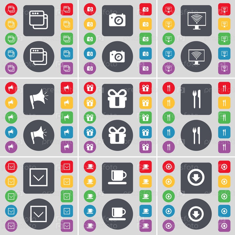 Окно, Камера, монитор, Мегафон, подарок, вилка и нож, стрелка вниз, Кубок, стрелка вниз значок символ. Большой набор плоских, цветные кнопки для вашего дизайна. Вектор