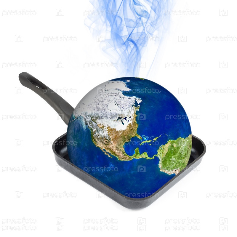 Концепция глобального потепления. Земля на сковороде, на белом фоне