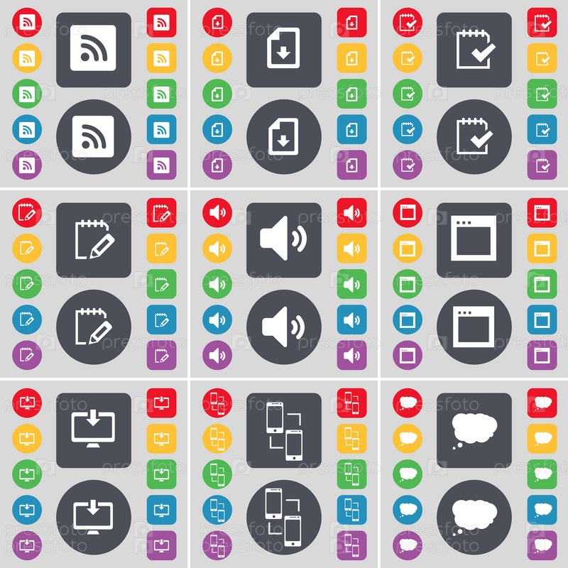 RSS, загрузка файлов, опросы, звук, окна, мониторы, связи, чат облако значок символа. большой набор плоских цветных кнопок для вашего дизайна. вектор
