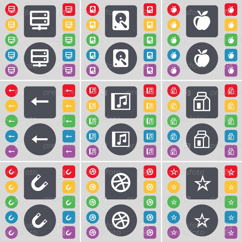 Серверы, жесткий диск, Apple, стрелка слева, музыкальные окна, упаковка, магнит, мяч, звезда значок символа. большой набор плоских цветных кнопок для вашего дизайна. вектор