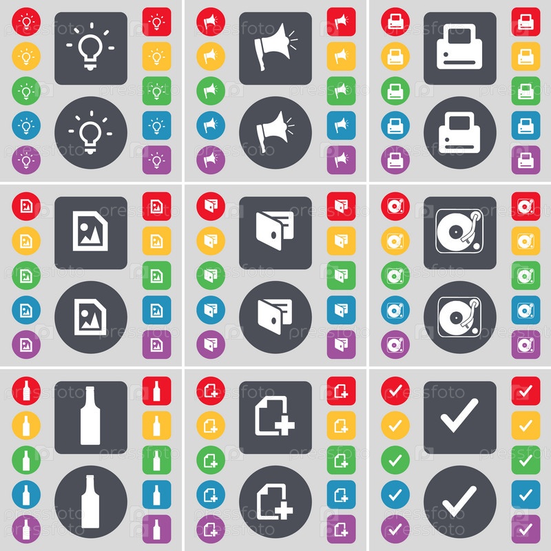 Лампочки, Мегафон, принтер, файл мультимедиа, бумажник, граммофон, бутылка, файл, отметьте значок символа. Большой набор плоских, цветные кнопки для вашего дизайна. Вектор