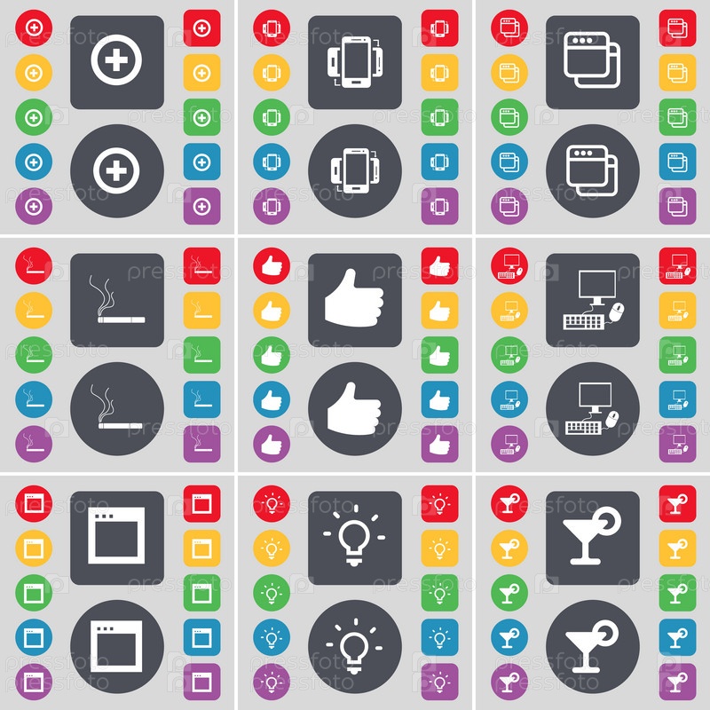 Плюс, смартфон, окна, сигареты, коктейль, компьютер, окна, световые лампы, иконка символа коктейля. большой набор плоских цветных кнопок для вашего дизайна. вектор