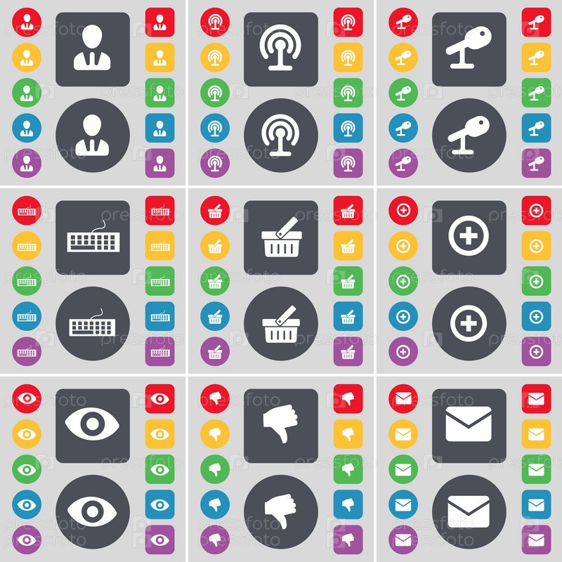 Аватар, Wi-Fi, микрофон, клавиатура, корзина, плюс, видение, неприязнь, сообщения значок символа. Большой набор плоских цветных кнопок для вашего дизайна. вектор
