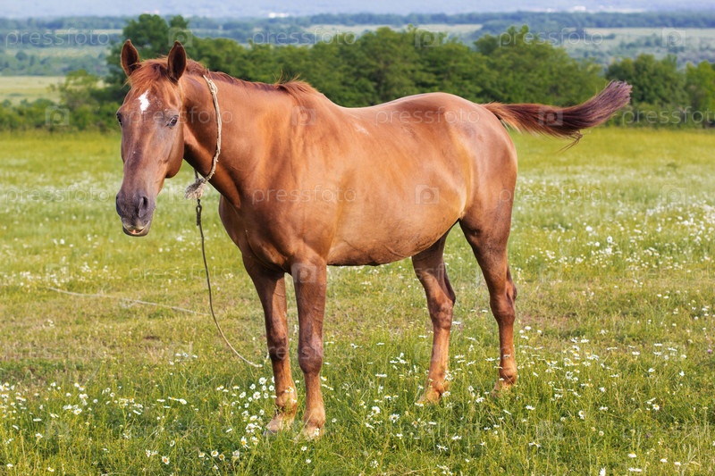 Красивая лошадь на зеленом поле