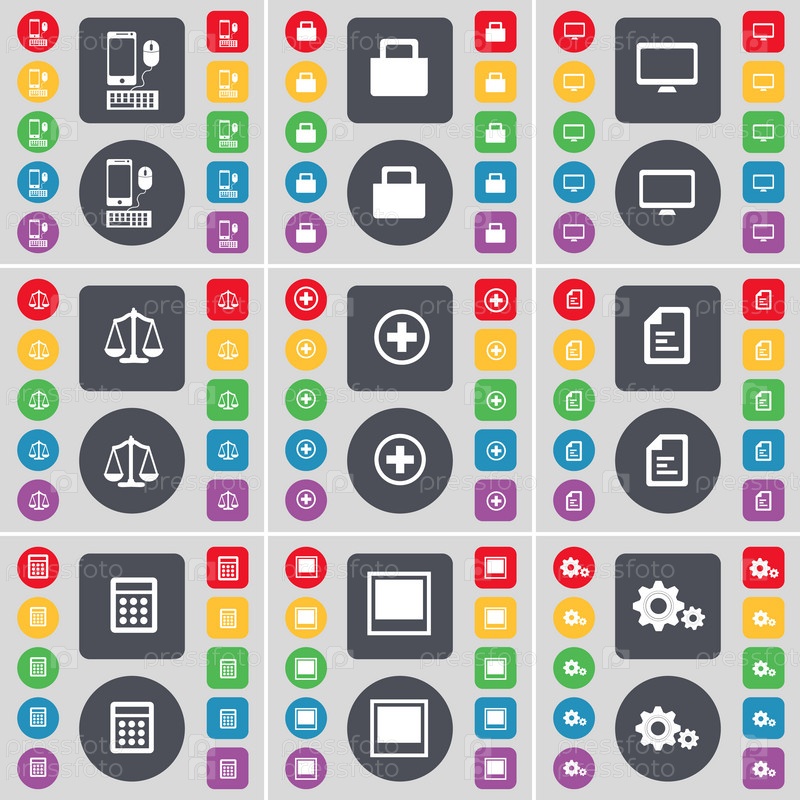 Смартфон, замок, монитор, весы, плюс, текстовых файлов, калькулятор, окно, значок шестеренка. Большой набор плоских, цветные кнопки для вашего дизайна. Вектор