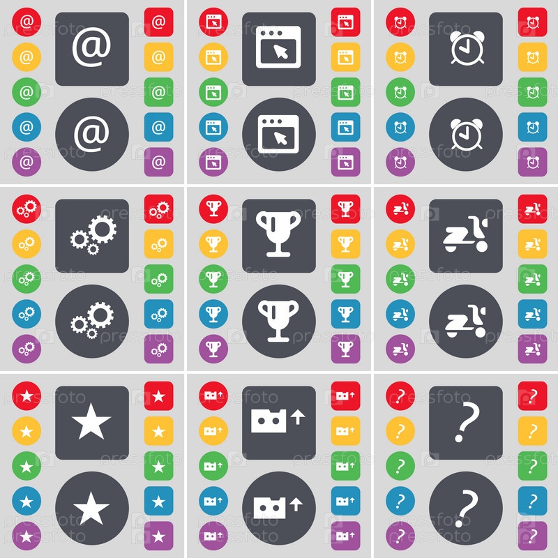 Почта, окна, Будильник, снаряжение, Кубок, скутер, звезда, кассета, значок символ вопросительного знака. Большой набор плоских, цветные кнопки для вашего дизайна. Вектор