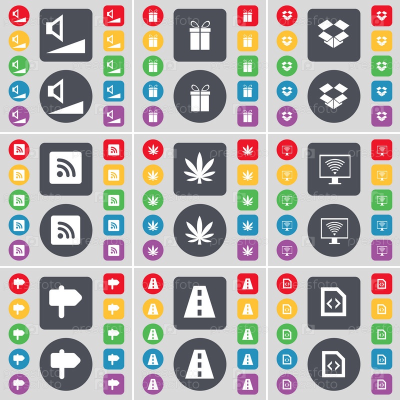 Объем, подарок, Dropbox, RSS, марихуана, монитор, указатель, дорога, символ файл значок. большой набор плоских цветных кнопок для вашего дизайна. вектор