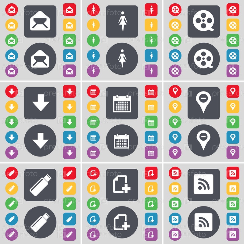 Сообщение, силуэт, видеозапись, стрелка влево, календарь, контрольный пункт, USB, файл RSS значок символа. Большой набор плоских цветных кнопок для вашего дизайна. вектор