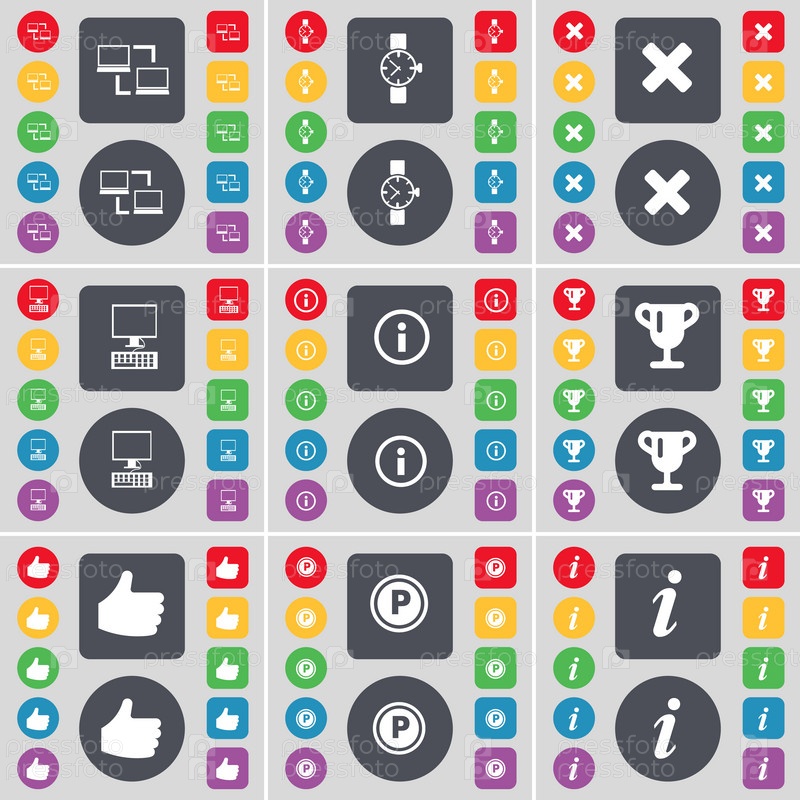 Подключение, наручные часы, стоп, ПК, информация, Кубок, рука, парковка, значок символа информации. Большой набор плоских цветных кнопок для вашего дизайна. вектор