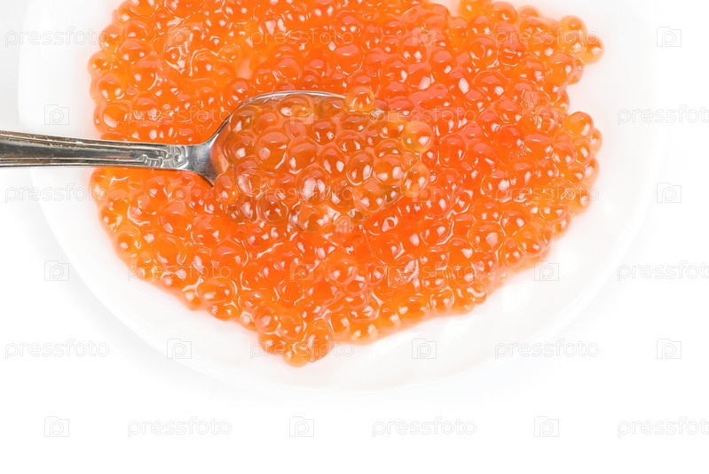 Красная икра с ложкой на белом фоне