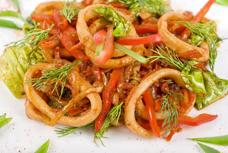 Салат из кальмаров и овощей крупным планом