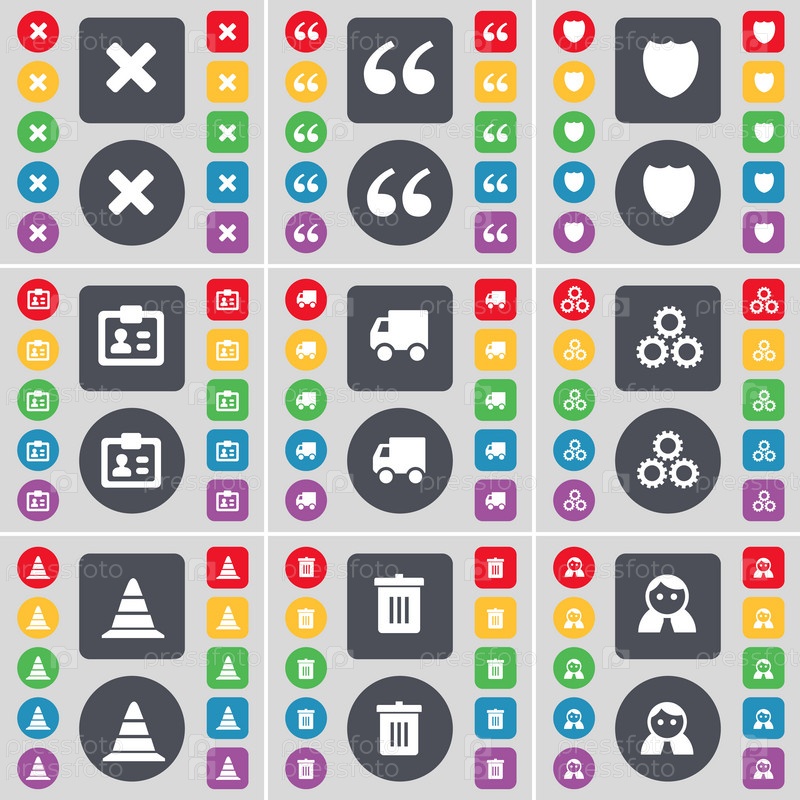 Стоп, кавычки, знак, кредитных карт, грузовик, снаряжение, конуса, мусорный бак, аватар значок символа. Большой набор плоских, цветные кнопки для вашего дизайна. Вектор