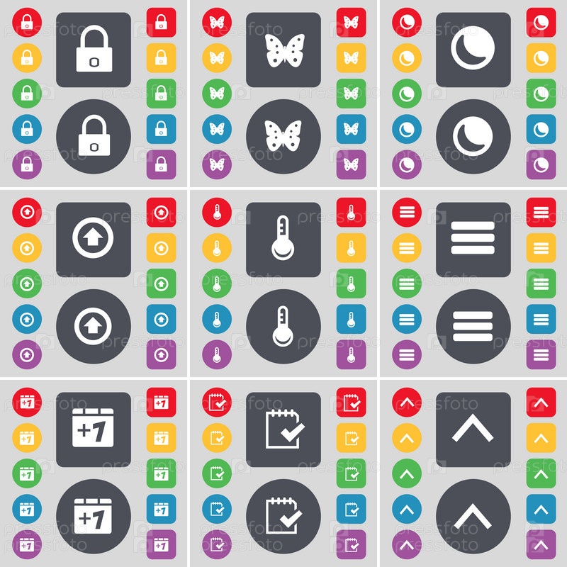 Замок, бабочка, луна, стрелка вверх, термометр, приложения, плюс один, исследования, значок символа стрелки вверх. большой набор плоских цветных кнопок для вашего дизайна. вектор