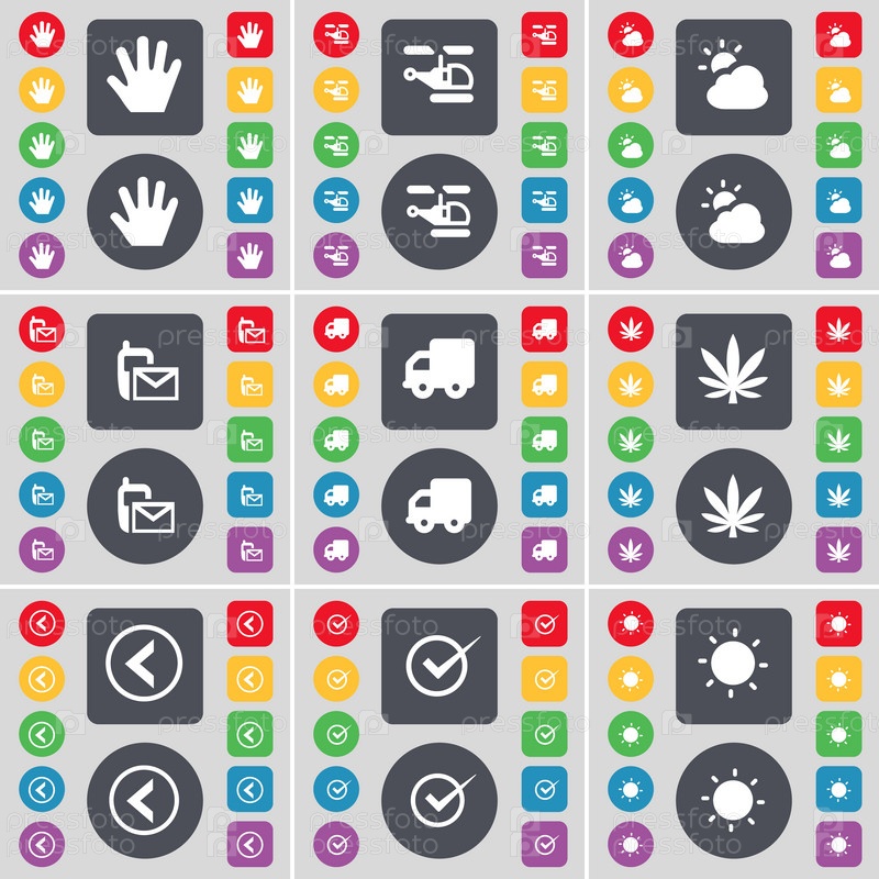Рука, вертолет, облако, SMS-сообщение, грузовик, марихуана, стрелка влево, тик, световой значок символа.Большой набор плоских цветных кнопок для вашего дизайна.Вектор