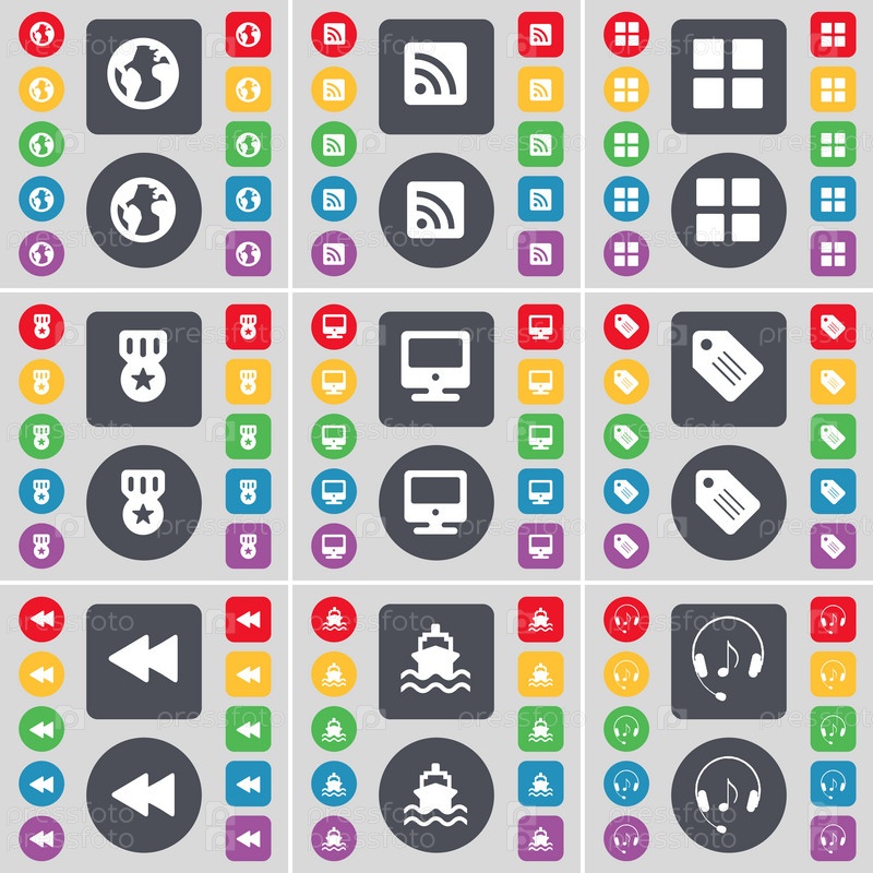 Земля, RSS, приложения, медаль, монитор, тег, Rewind, корабль, символ значка наушников. большой набор плоских цветных кнопок для вашего дизайна. вектор