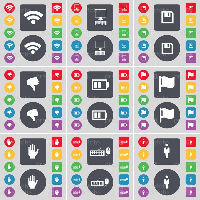Wi-Fi, ПК, флопи, враждебность, батарея, флаг, рука, клавиатура, силуэт значка символа. большой набор плоских цветных кнопок для вашего дизайна. вектор